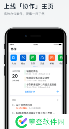 【智能办公应用】提供考勤、签到、审批、日志、公告、请假、报销、出差等OA功能,同时支持企业自定义应用接入,全面实现智能移动办公。