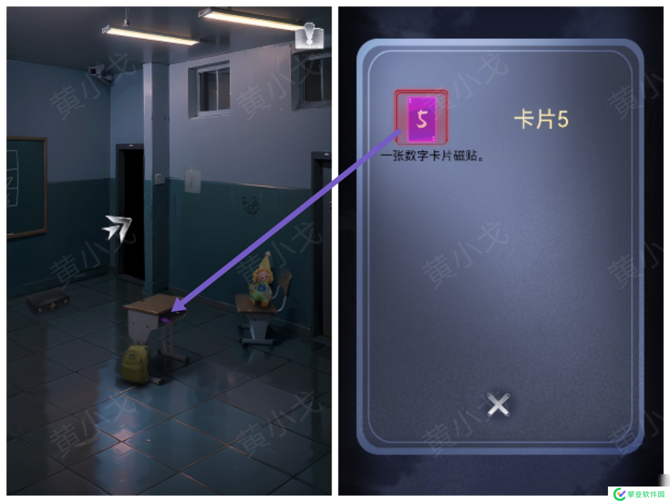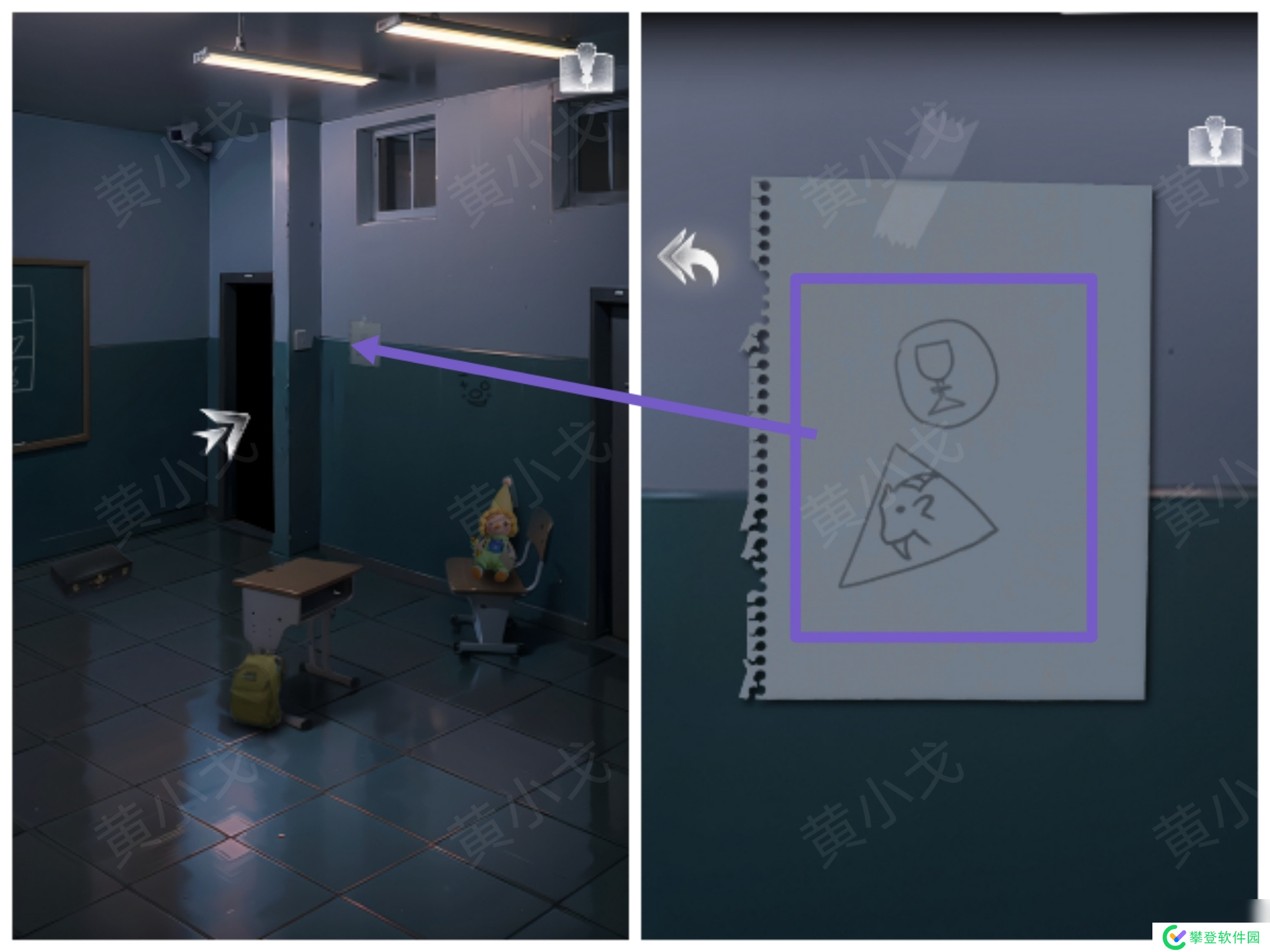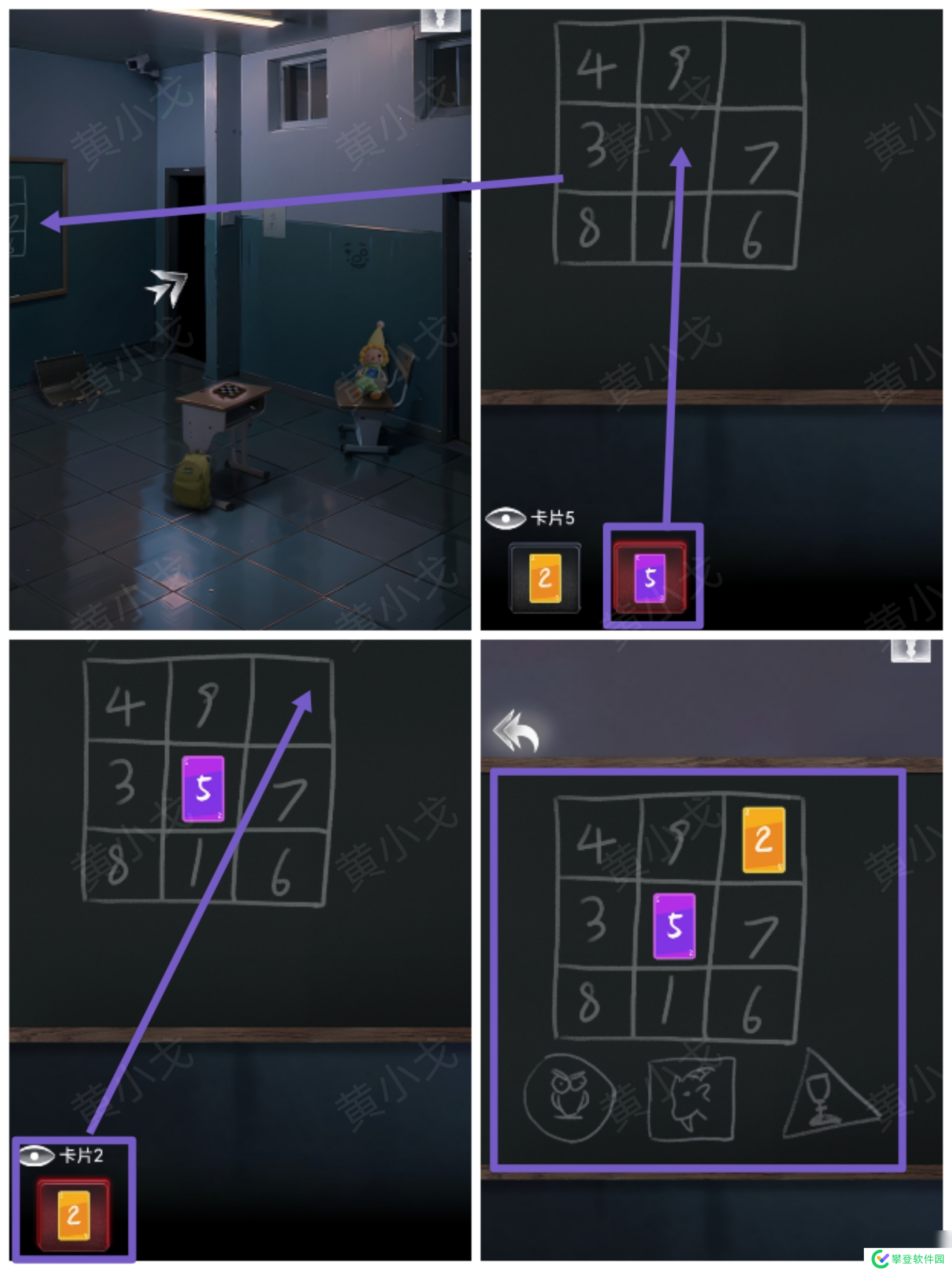 14.点击黑板,把【卡片5】和【卡片2】放入九宫格正确的位置。墙上出现图案,告诉女主