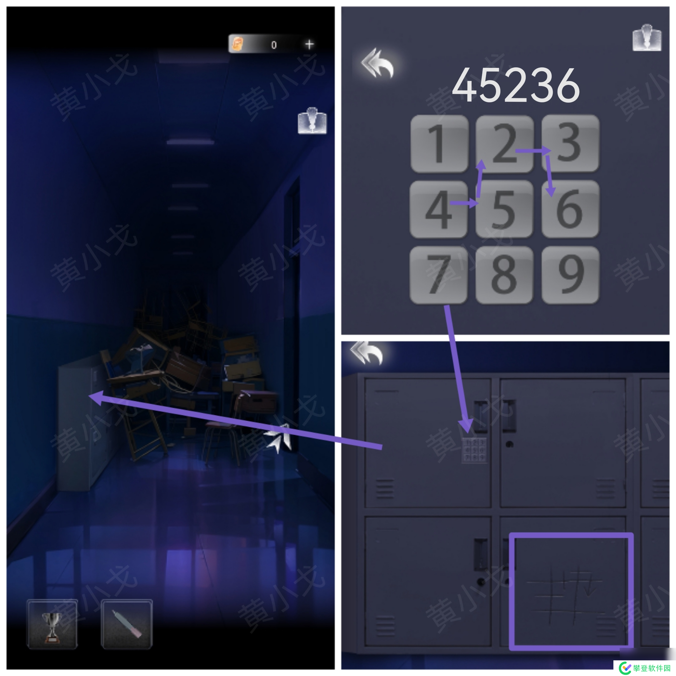 2.点击柜子上的密码锁,根据下方柜子上的刻痕提示,结合密码锁上的九宫格,输入密码:45236