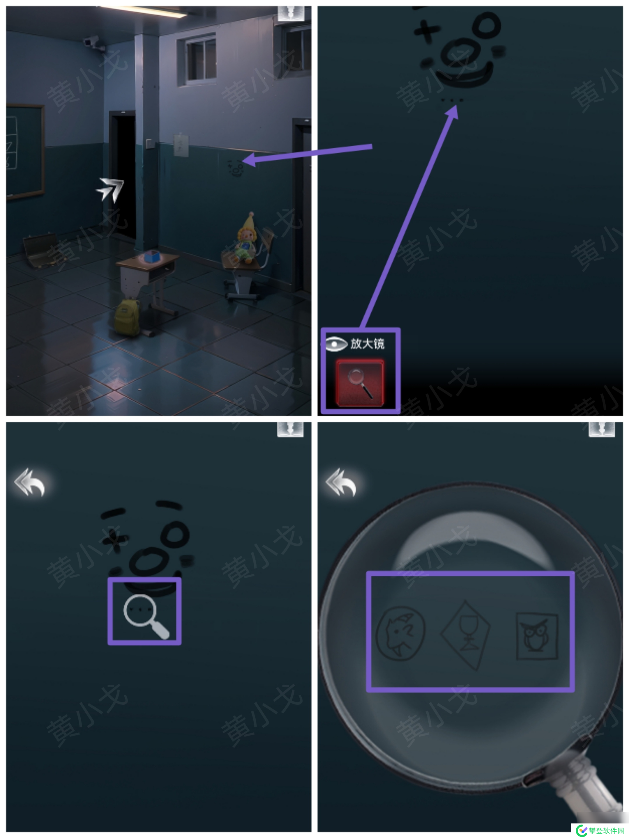 18.点击墙上的小丑涂鸦,使用【放大镜】,获得图形线索,然后告诉女主