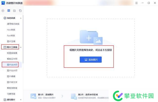 第一步:打开软件后,点击【图片工具箱】下的【图片去水印】功能,接着使用【添加图片】将需要去除水印的图片添加进软件中。