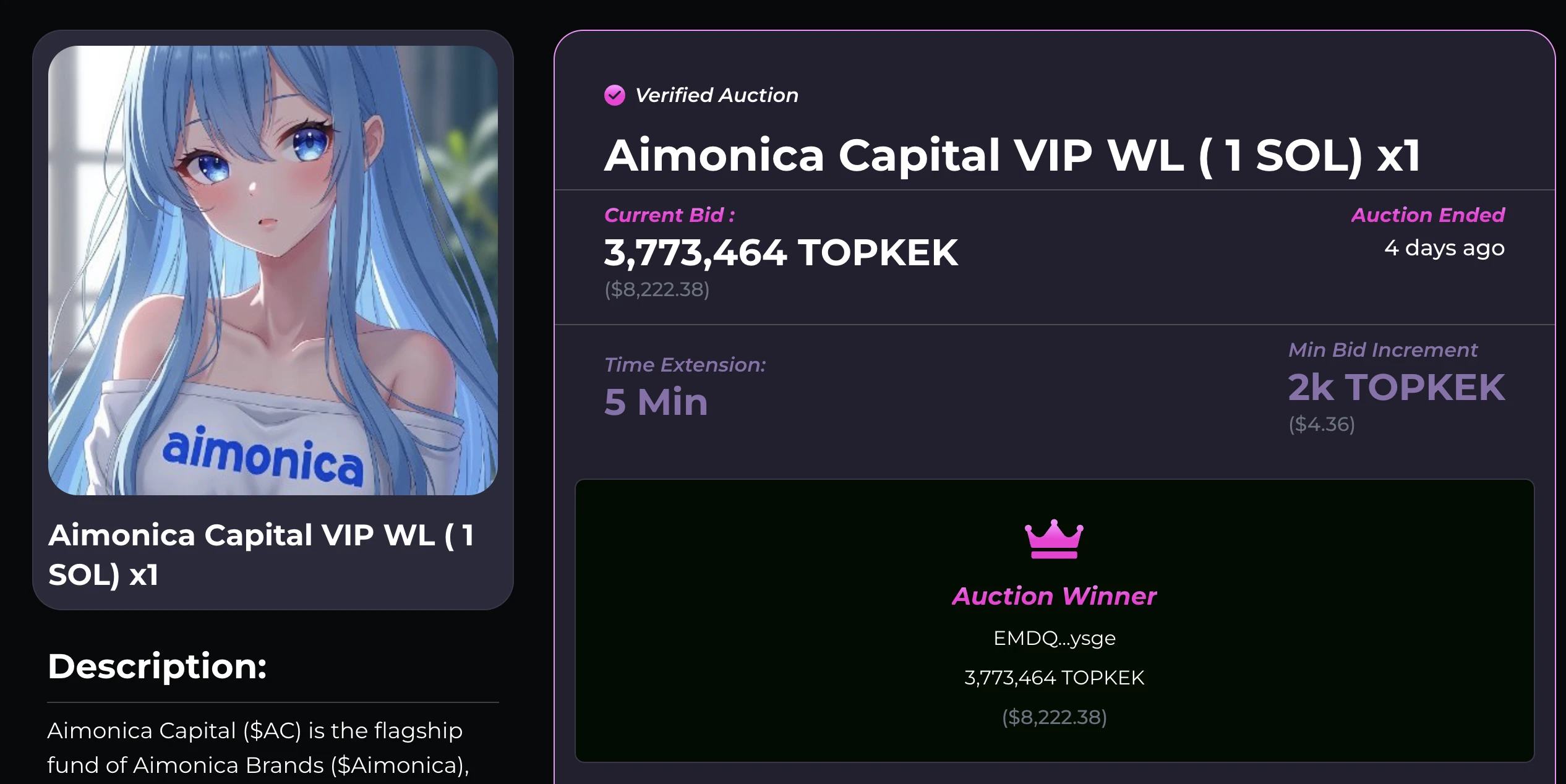 Aimonica Capital (AC)项目前期白名单拍卖阶段,市场热情高涨,预示着其极有可能成为下一个“爆款项目”。在与TOPKEK Capital合作的两轮白名单拍卖中,0.5 SOL份额最终拍得1,903,462枚TOPKEK代币(约合4100美元),而1 SOL份额则拍得3,773,464枚TOPKEK代币(约合8200美元)。