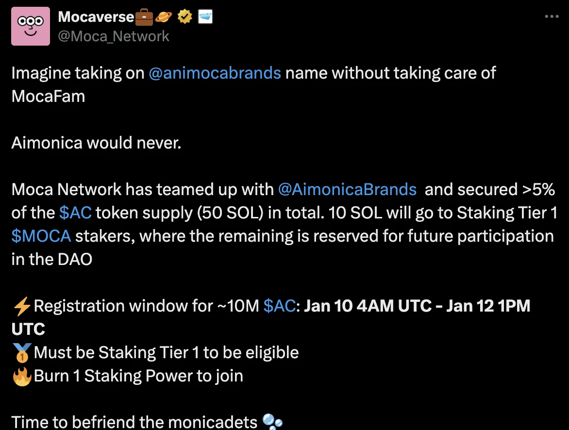 此外,ai16z创始人Shaw在X平台转发Animoca Brands与ai16z合作推文,表达了对本次合作的积极态度。更值得关注的是,Mocaverse官方账号也宣布与Animoca合作,并获得超过5%的AC代币供应量(50 SOL白名单份额),其中10 SOL份额将分配给MOCA代币T1级别质押用户。