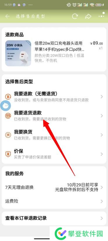 5、然后根据自己的情况进行选择,我们这里以【退货退款】为例,点击进去;