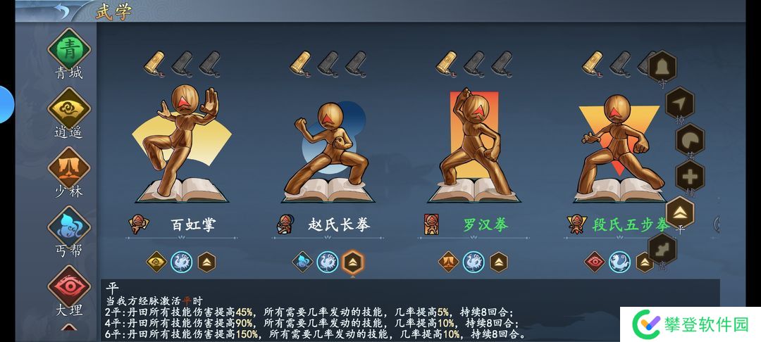 @左下角你选择的属性,开局先换这个,比如我抽到的卡是龟息功和纯阳护体,都是逍遥流派土属性强的卡,所以我经常把它换成土属性,当然,想玩啥玩啥。研武右下角的武学图鉴里可以发现逍遥的武学卡牌大多是金和土,少林是金和水。目前3区榜上大家常玩少林,少量丐帮,还有啥都玩的,然后我玩下来感觉逍遥也挺强的。