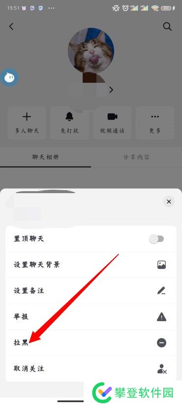 5、最后,在弹出窗口中,找到并点击【拉黑】,这样我们就再也不会收到他的消息啦。