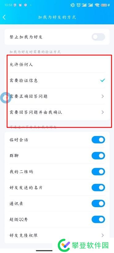 5、在这里,我们就可以自行选择加我为好友的方式啦,还可以选择第一行的禁止别人加我为好友哦。