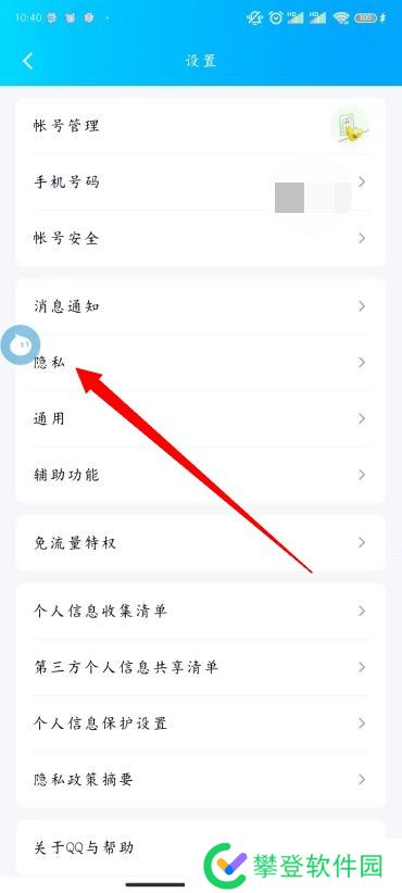 3、进入设置界面,我们选择并点击【隐私】选项;