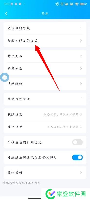 4、然后我们点击页面第二行的【加我为好友的方式】选项;