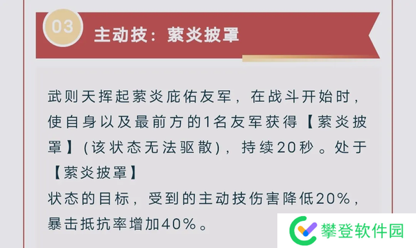 这个技能的出现,使武则天可为诱饵,去承受第一波伤害,队伍搭配必须有鉴真保护。