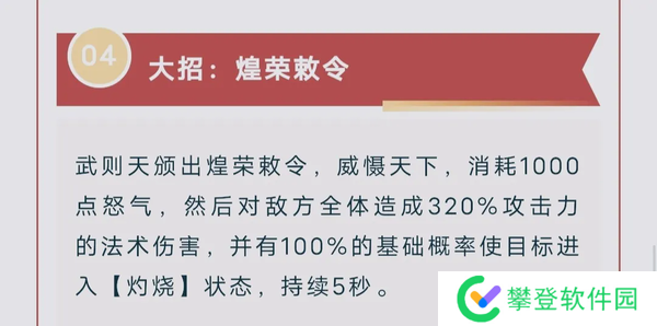 ①令月在场时,有提高【灼烧】伤害的被动,搭配武则天的【灼烧】,能打出更多伤害。
