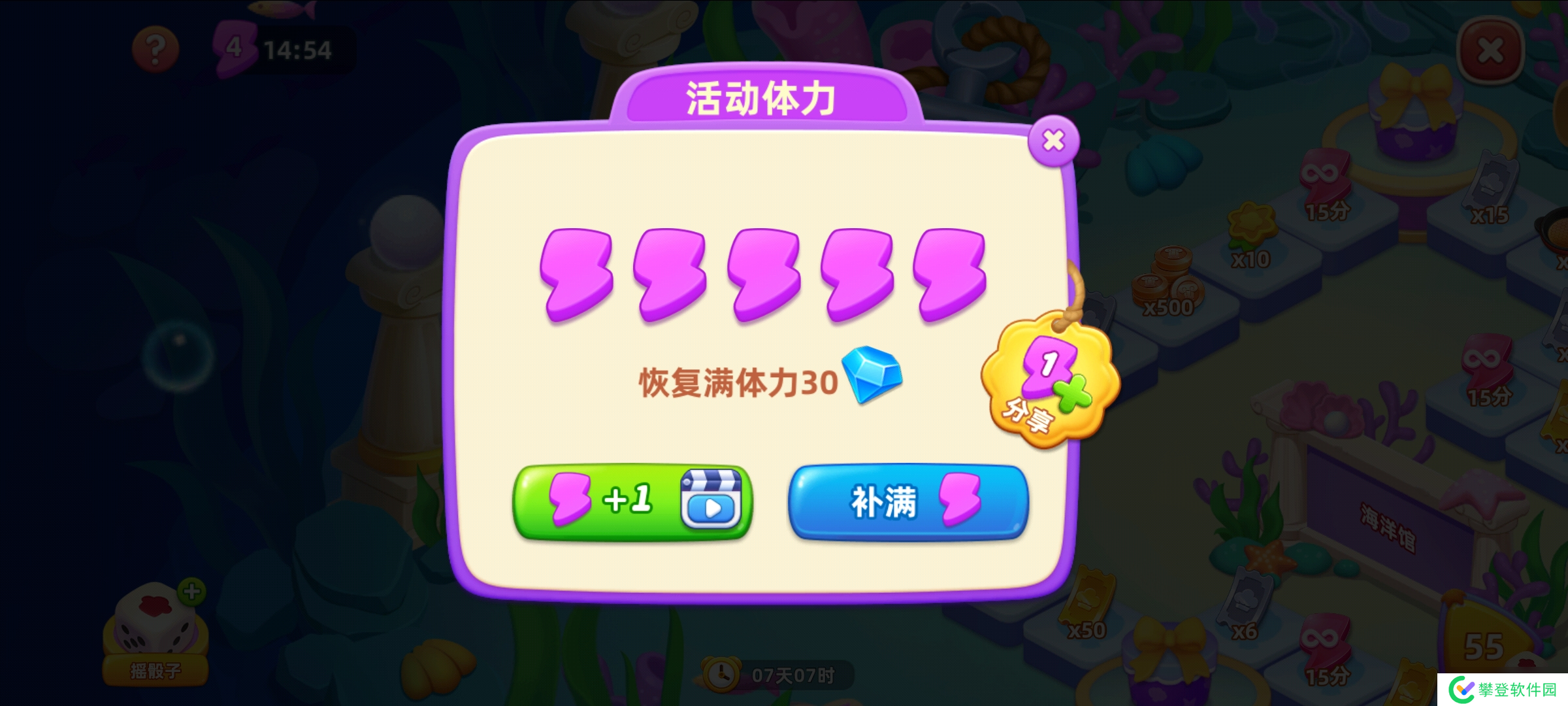 活动关卡体力获取方式:倒计时恢复、活动体力界面使用钻石补满、分享/看视频获取体力;