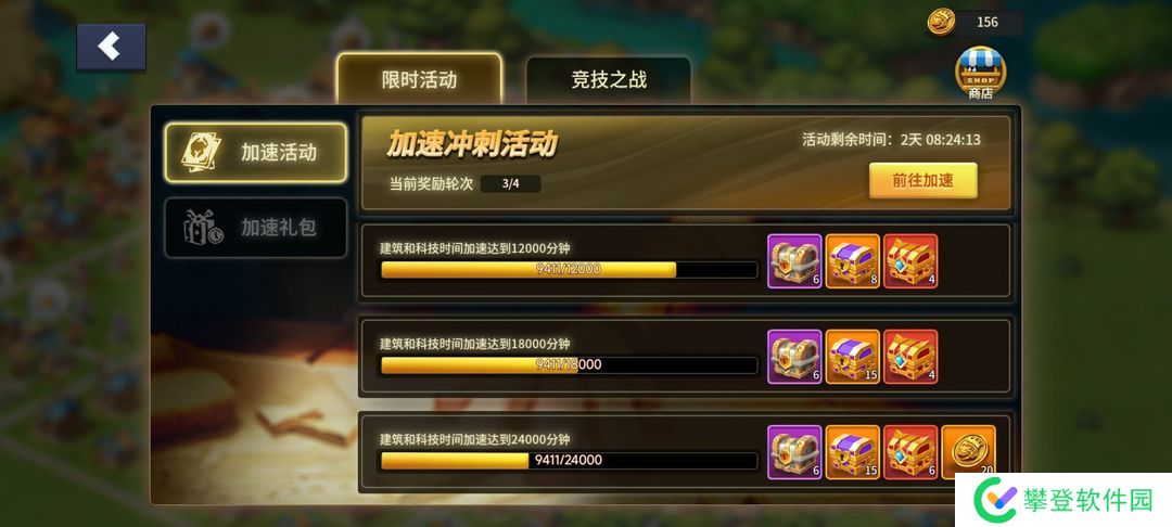 图片上是加速活动的要求和奖励,一共四轮每轮2.4万加速才能拿到全部奖励,建造和科技加速都算