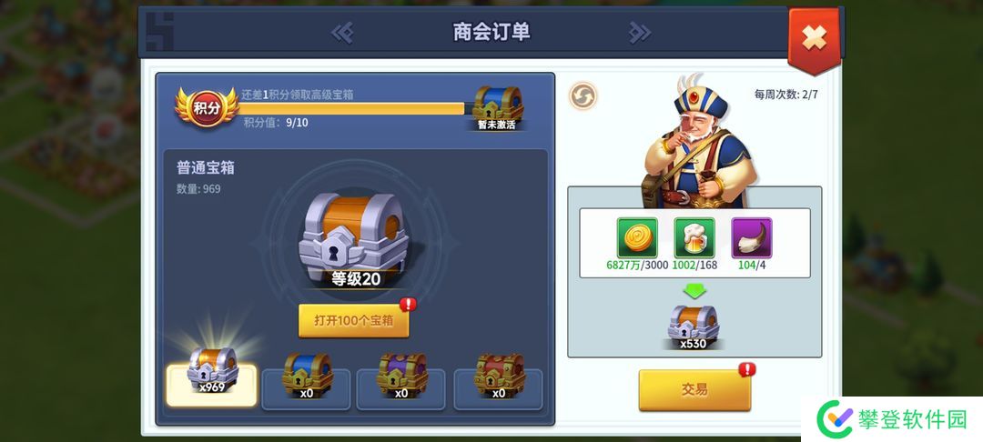 图片上是20级商会,每天交易一次宝箱数量就是每次530商会等级越高每天交易宝箱越多
