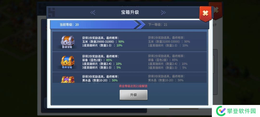 4、商会很重要,决定每天宝箱数量和开宝箱获得的物质品质,所以商会等级能拉多高拉多高。蓝色装备宝箱建议商会13级后左右在开否则很亏,13级后开获得蓝色一星装备,或者20级后再开,20级后开获得蓝色2星装备,自己决定。