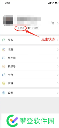 1、首先打开微信,点击我的进入个人主页,在头像的下面点击【状态】进入;