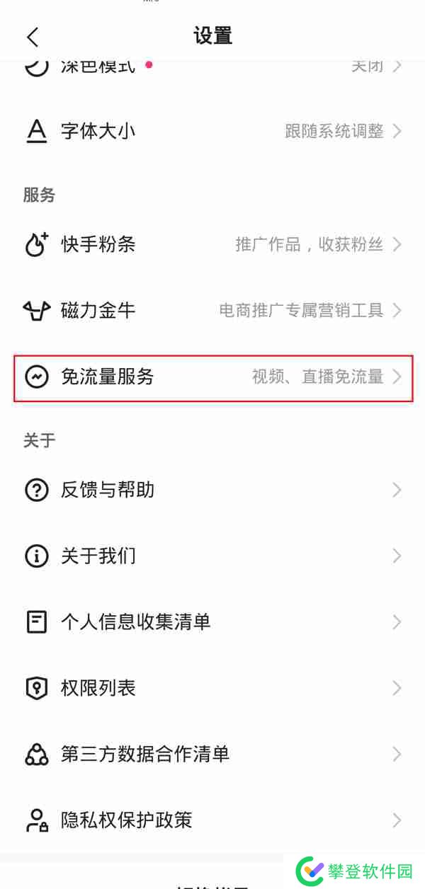 打开快手App,点击首页右上角的三横线图标,进入“设置”菜单。然后找到并点击“免流量服务”选项。