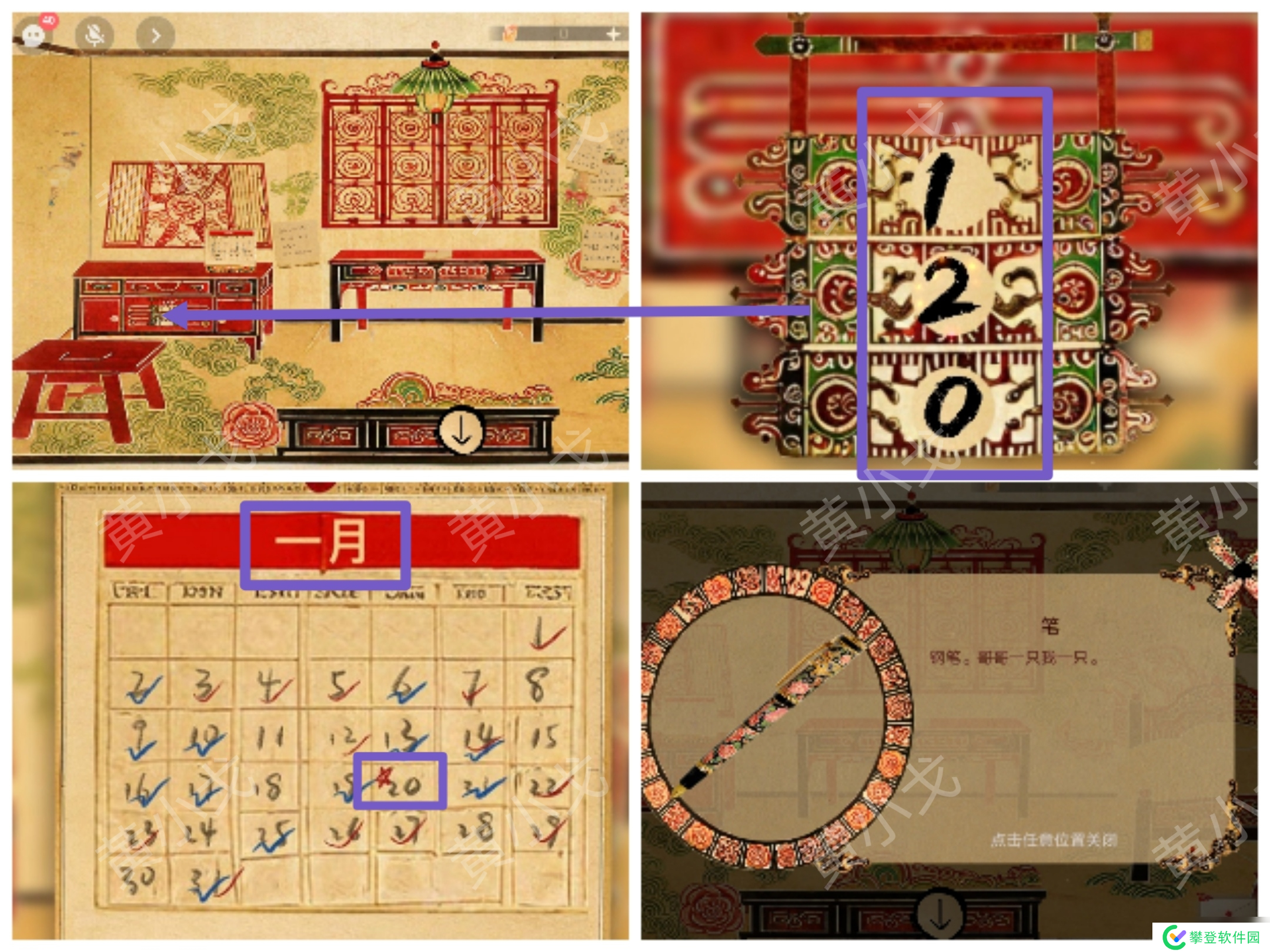 4.点击柜子上的密码锁,根据日历上的线索,输入密码:120;打开柜子,获得【笔】