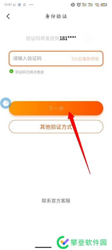 6、然后将收到的验证码键入输入框,并点击下方的【下一步】;