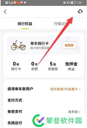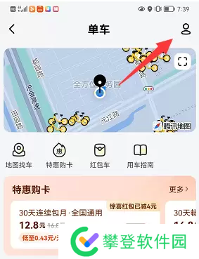 2、进入骑车页面以后,点击右上角的【个人中心】。