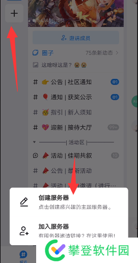 2、点击左上角的【+】,然后在底部弹窗中选择创建或者加入服务器。