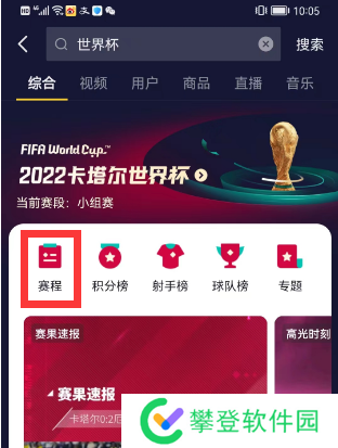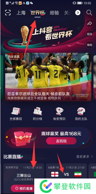 1、我们进入抖音在顶部频道找到世界杯,然后点击进入查看对应赛程即可。