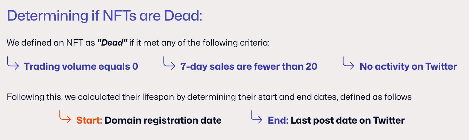 另根据该报告,他们将96%的NFT判定为「已死」,所谓死亡的NFT指的是交易量为零、7天内销售量低于20件,以及社交媒体活动微弱。