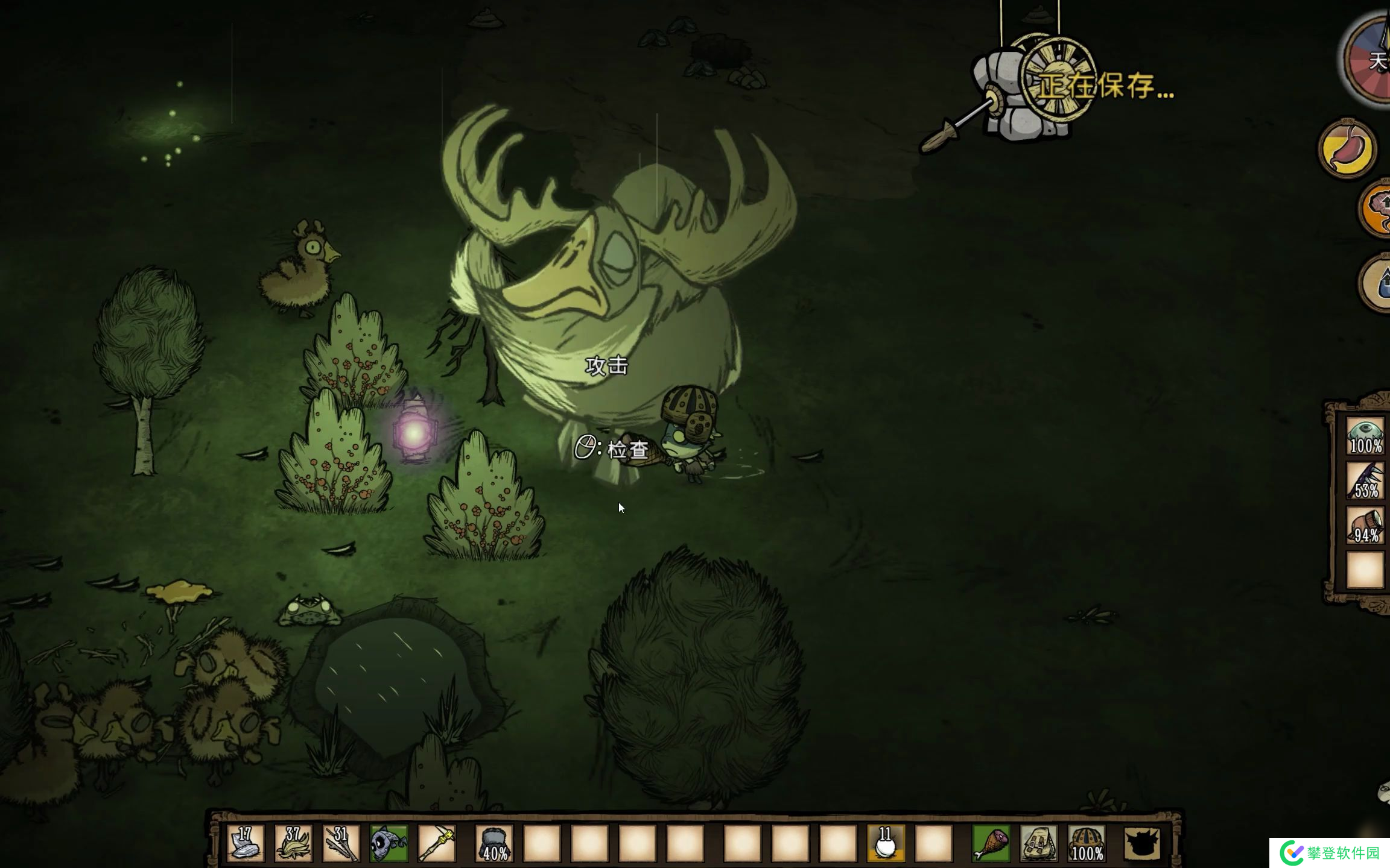 鹿鸭对非玩家生物则有150点伤害,生成点只会在地形生成时生成。在地形生成时,有两种生成鹿鸭生成点的方式。第一种是以固定布景的方式生成,这种方式生成鹿鸭生成点最多有9个,而且会额外带有1个池塘、3个胡萝卜,依世界变异倾向而定还会有5个普通浆果丛或者3个多汁浆果丛。还会生成5棵树,每棵树有50%几率是常青树和桦栗树,树和浆果丛可能会因为地形的原因不生成。
