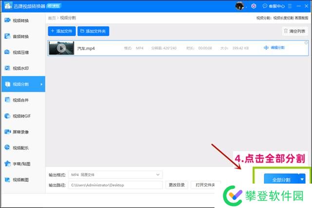 步骤四 编辑好视频片段之后,点击【全部分割】,等待一会儿即可完成。完成的视频文字自动生成文件夹保存在桌面。