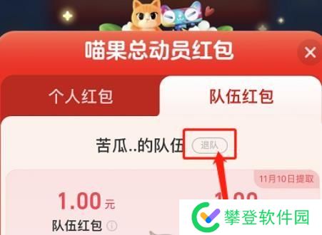 ③队伍成员退队时,从所退出队伍的队伍红包中,按其对队伍红包的贡献度(即该队员对整体“入场费”的分担比例及通过“队员上线助力”、“拉人助力”等方式为队伍喵树提升的总等级数占比)分得个人部分,并归属至新队伍红包中,同时其贡献的队伍红包额度也将从所退出队伍中扣除,其余未退队成员不进行分配直至最后一个比赛日结束。