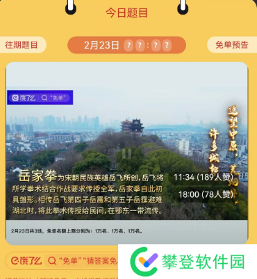 今天的饿了么免单活动,题目是一个视频,玩家需要通过视频中关于岳家拳的相关内容,猜出本场三个免单时间,下面是本站为大家整理的饿了么2.23免单答案时间预测,让我们一起深入了解一下吧。
