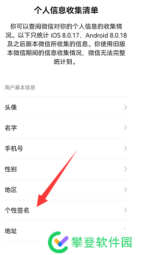 3、第三步:在个人信息手机清单中找到下图箭头所指的【个性签名】。