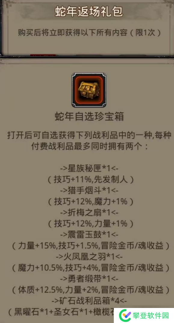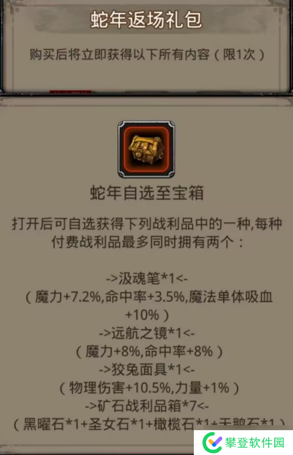 地下城堡2:黑暗觉醒蛇年自选礼包——战利品分析如下:
