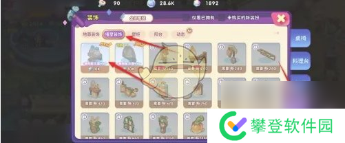2、接着在装修页面,点击左侧的装饰,找到调料瓶挂件进行购买;