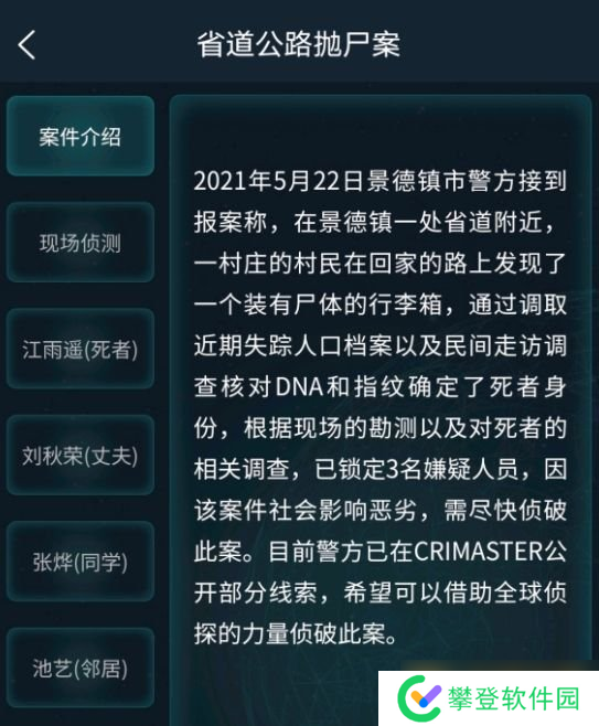 《Crimaster犯罪大师》是一款深受玩家喜爱的案件推理类型的解谜游戏,近期发布了最新一期的答题内容:省道公路抛尸案,根据凶手在现场遗留的线索,我们要正确回答两道题目,接下来本站小编就给大家整理了《Crimaster犯罪大师》省道公路抛尸案答案解析,一起看看吧。