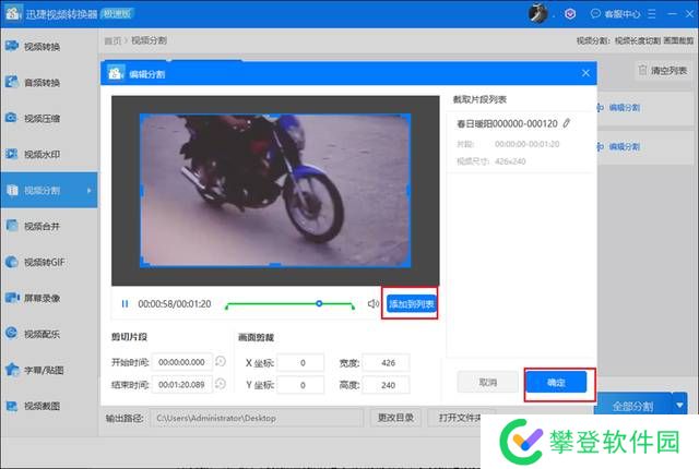 上传好视频之后,接下来我们点击视频旁边的“编辑分割”操作即可对视频进行分割。将下方的滑动杆,滑动到需要分割的地方,点击“添加到列表”和“确定”即可。