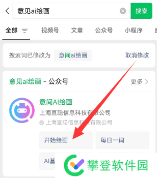 1、首先我们需要点击微信搜索【意间AI绘画】,找到下图搜索结果以后,点击开始绘画。