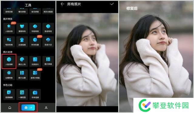 VideoLab是一款手机视频图片美化工具,支持许多的图片特效,也支持人脸清晰功能,我们打开之后在【工具】栏找到【图片处理】-【人脸清晰】,上传我们的模糊照片,照片就变高清了。