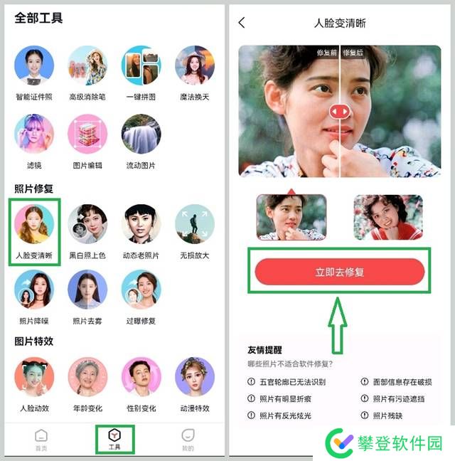 打开之后选择【工具】-【照片修复】-【人脸变清晰】,点击【立即去修复】,上传我们的模糊照片。