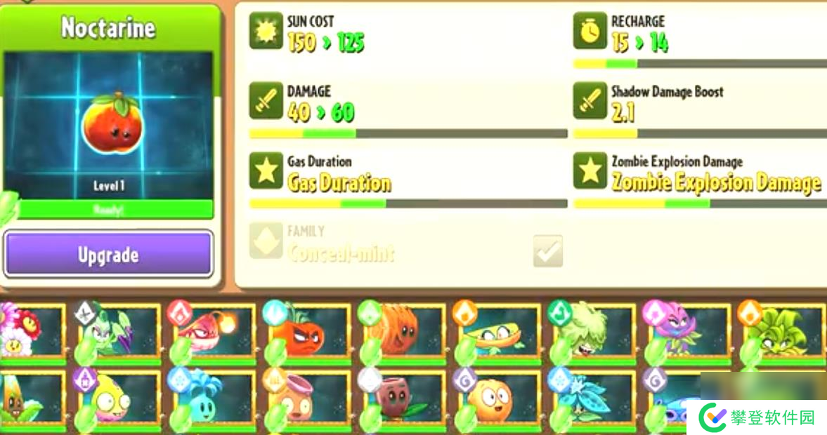 夜影油桃单次种植需要消耗150点阳光,自身有着15秒的冷却。种植之后的夜影油桃会产生爆炸,但无法造成伤害,爆炸之后的夜影油桃会召唤出油桃气团加入战斗,如果自身处于暗影状态,那么召唤出来的油桃气团会变得更强。油桃气团是一种特殊的植物,可以在自身周围生成暗影微光,并对经过的僵尸造成伤害。一次攻击至多持续10秒,在油桃气团的影响下,僵尸受到其他暗影植物的伤害会提升至原先的1.5倍。如果是暗影状态下的油桃气团,不仅可以使生效时间延长到15秒,而且还能令其他植物单位的伤害提升至两倍,当然,不包括油桃气团自身。