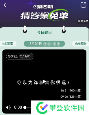 最新的饿了么免单3.1最新答案预测,今天的题目是和反诈有关,用户需要根据视频中的线索推测出本期免单时间是什么时候,下面是本站为大家整理的最新免单答案,希望对你有所帮助。
