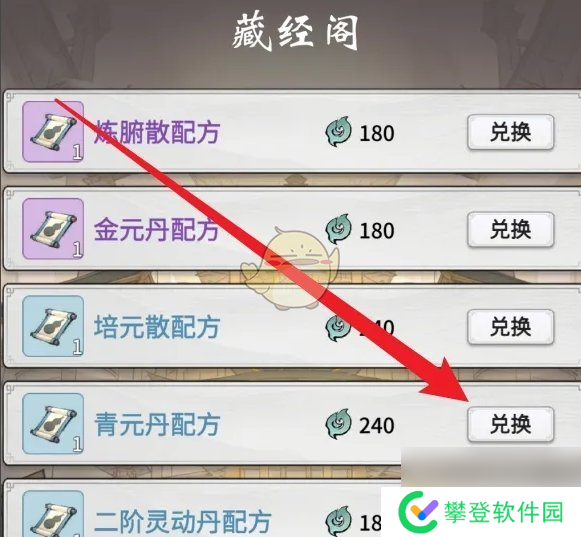 3、在弹出的丹药配方中,找到青元丹并点击兑换;