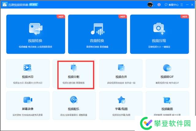 第一步 打开【迅捷视频剪辑软件】,进入首页,看到【视频分割】选项,点击选择。