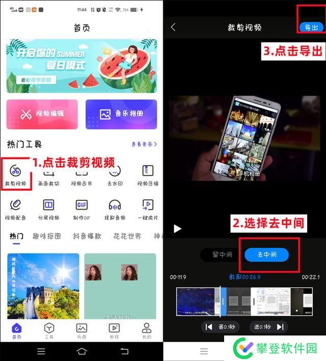 打开软件,点击【裁剪视频】选项,然后上传保存在相册的视频文件,点击【去中间】。滑动选择好需要删除的部分,选择好之后,点击【导出】即可实现视频的裁剪。