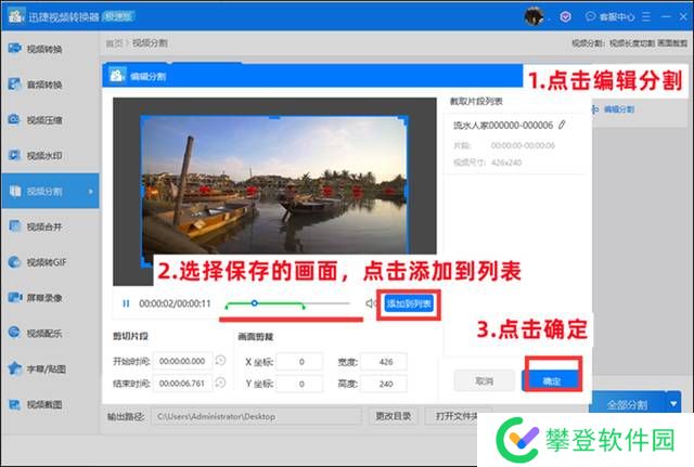 第三步 点击【编辑分割】即可进入到编辑页面,滑动下方的滑动杆到需要剪辑的位置,点击【添加到列表】,并点击【确定】即可返回到上一页面。