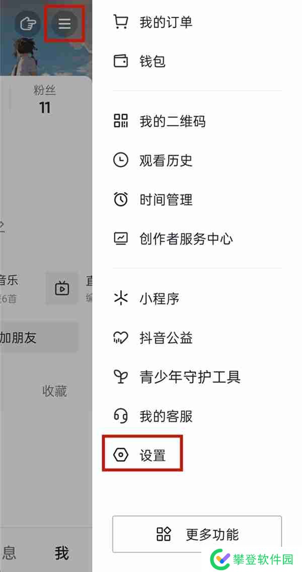 - 打开抖音APP,点击“我”页面右上角的三条横线(或三个点)图标,然后选择“设置”。