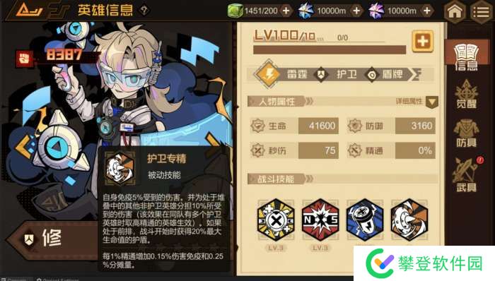 技能介绍:自身免疫5%受到的伤害。并为处于堆叠中的其他非护卫英雄分担10%所受到的伤害(该效果在同队有多个护卫英雄时取高精通的英雄生效)。如果处于前排,战斗开始时获得20%最大生命值的护盾