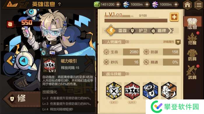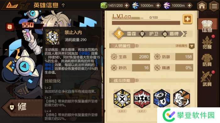 技能强化:Lv.2 伤害量提升至修防御力的66%;Lv.3 伤害量提升至修防御力的80%;Lv.4 释放间隔缩短3秒