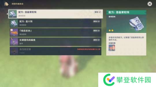纳塔钓鱼协会(圣火竞技场西南边):配方:澄晶果粒饵、配方:温火饵、室外摆设图纸:「熔流岩池」、鱼竿:长犀圆鸟和扁鱼