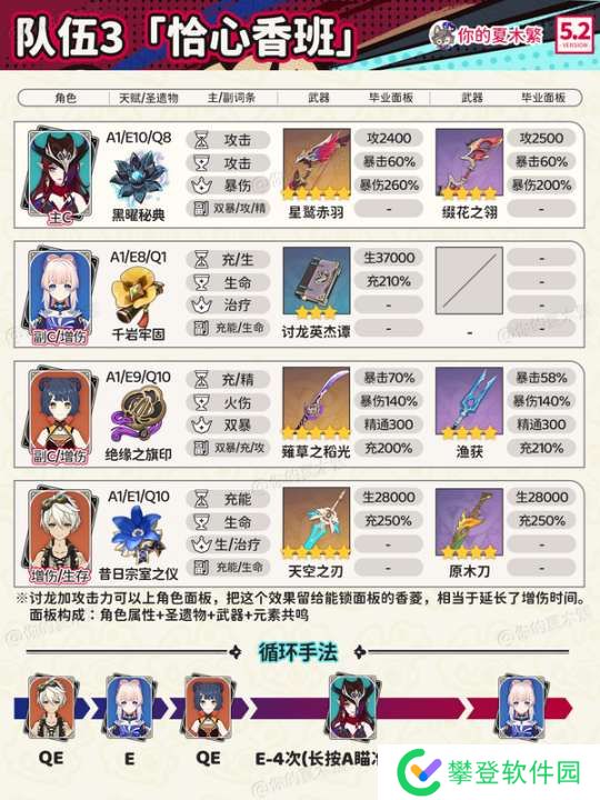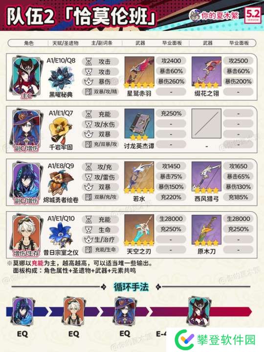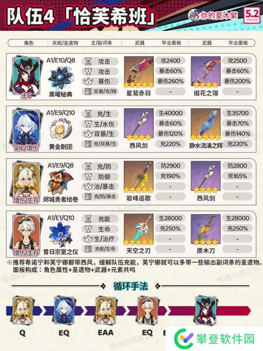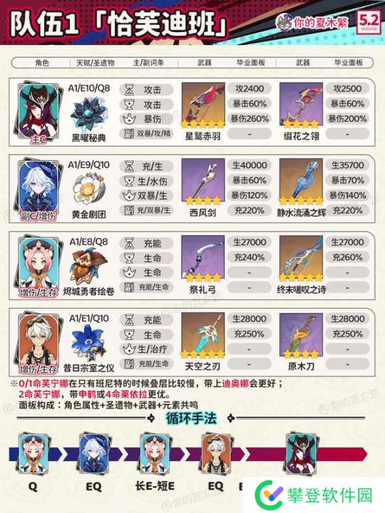 包含 4个 配队所有角色的武器、圣遗物、毕业面板和队伍循环手法